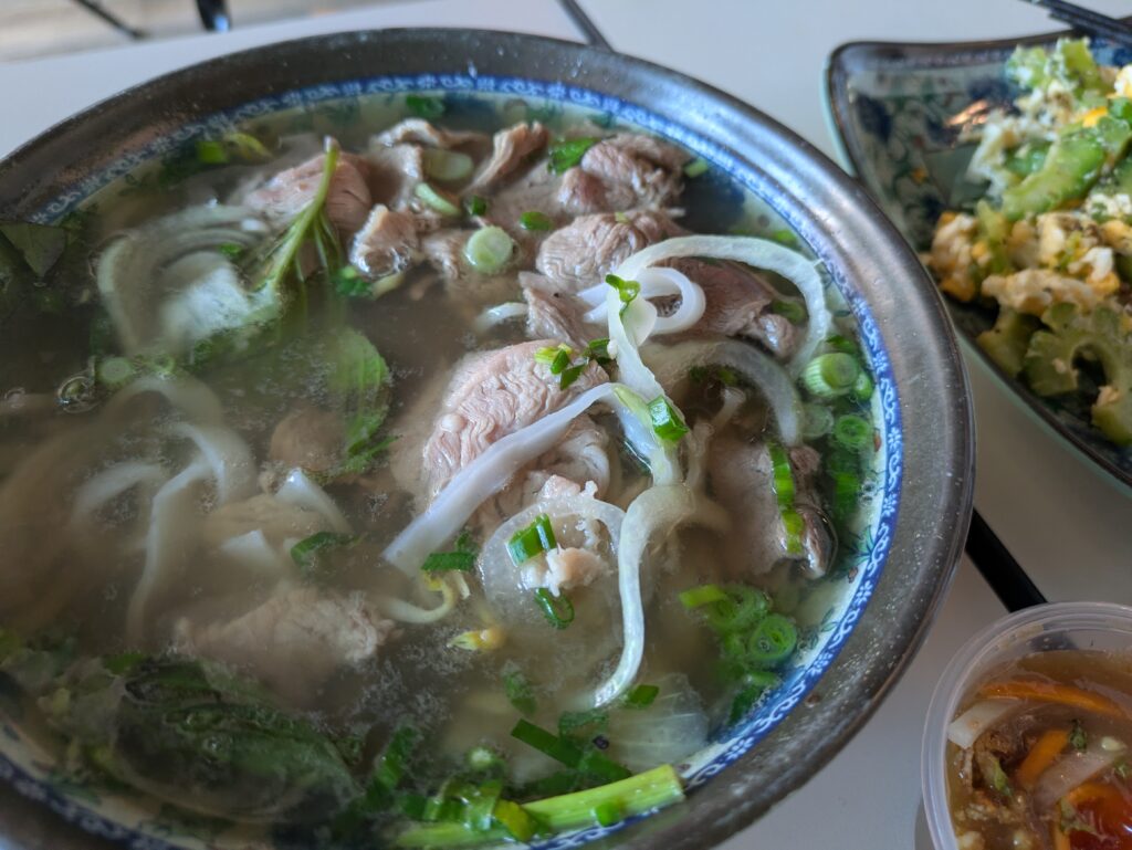 牛肉のフォーです。パクチーがわっさわさと入っていて、よく分からない葉っぱも入っていました。私はパクチーがそこまで得意じゃないのですが、まぁいけたかな?という感じ。